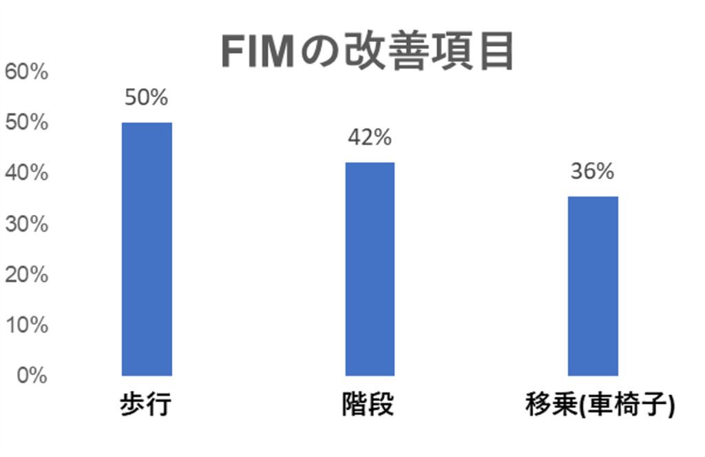 改善したFIM項目については、歩行、階段、移乗(車椅子への乗り移り)が多かった。